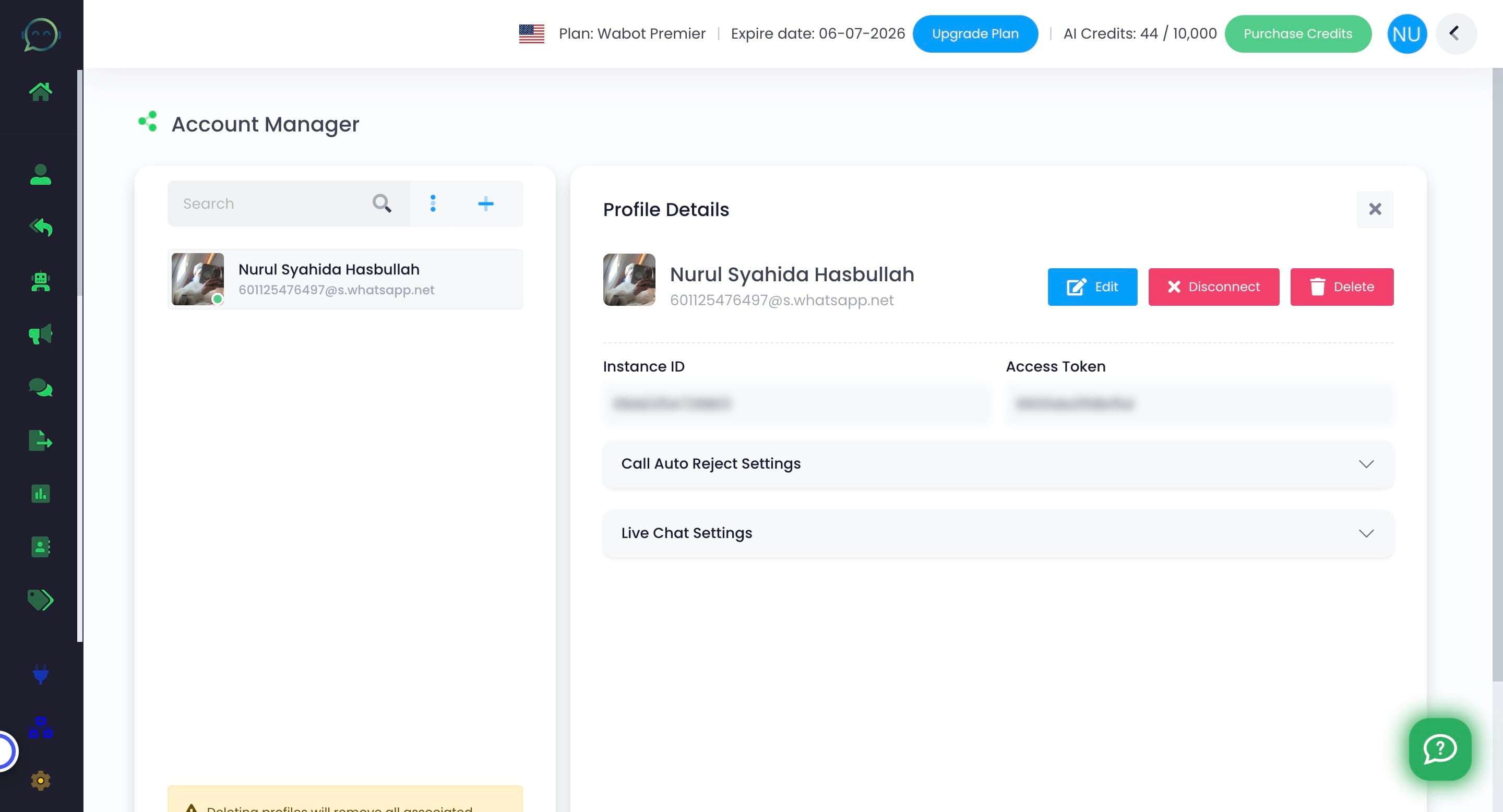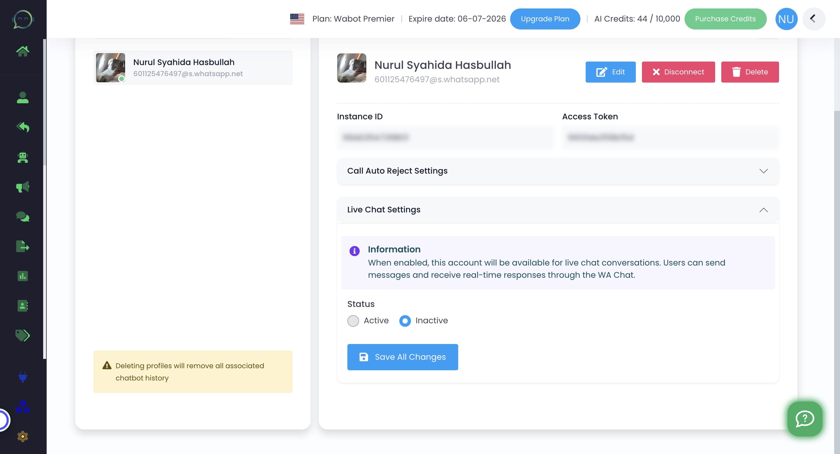 Decide whether this number will be the preselected chat to view on WA Live Chat. Only one account can be the default chat